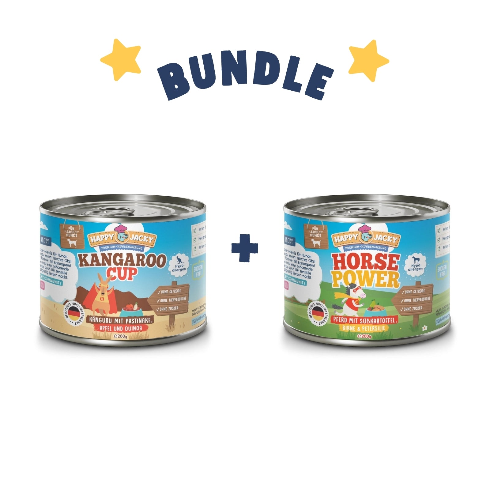 Kombiniere unsere exotischen Geschmacksrichtungen Kangaroo Cup, Känguru mit Pastinake, Apfel & Quinoa, Rote Beete & Rosmarin und Horse Power, Pferd mit Süßkartoffel, Birne & Petersilie, und spare! Du erhältst jeweils 6 Dosen 200g der Kangaroo Cup und Horse Power.